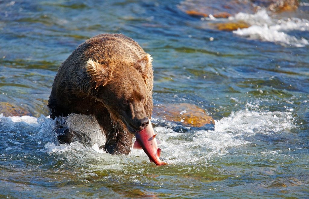 Grizzlybjørn (brunbjørn) lever i kystområdet. De kan bli store, spesielt etter at de har spist seg gode og mette på laks.